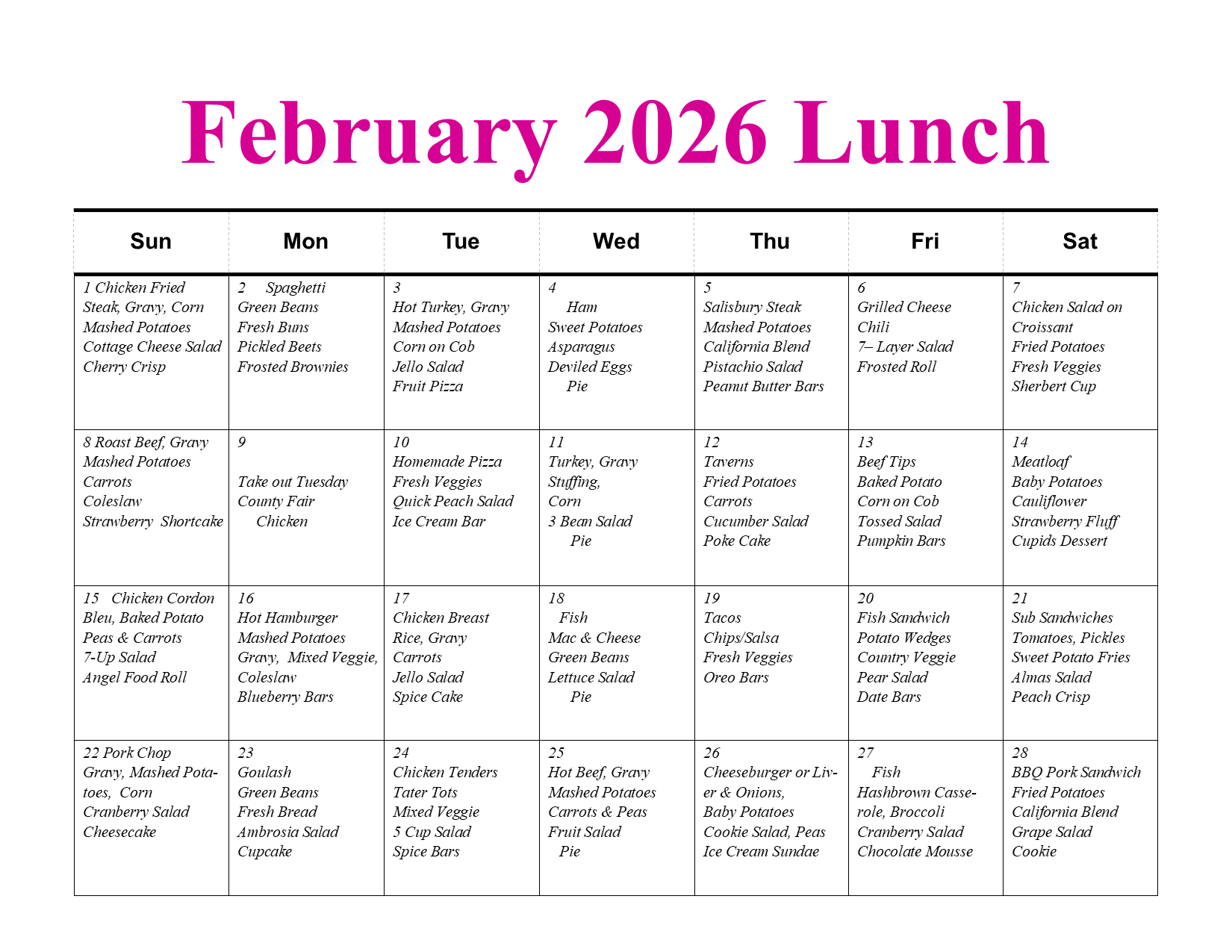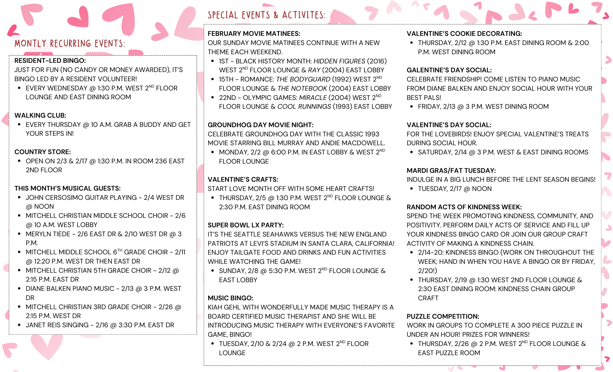 We’re excited for a month full of laughter, connection, and meaningful moments. Be sure to check out our full February Activity Calendar and Menus for all the details!