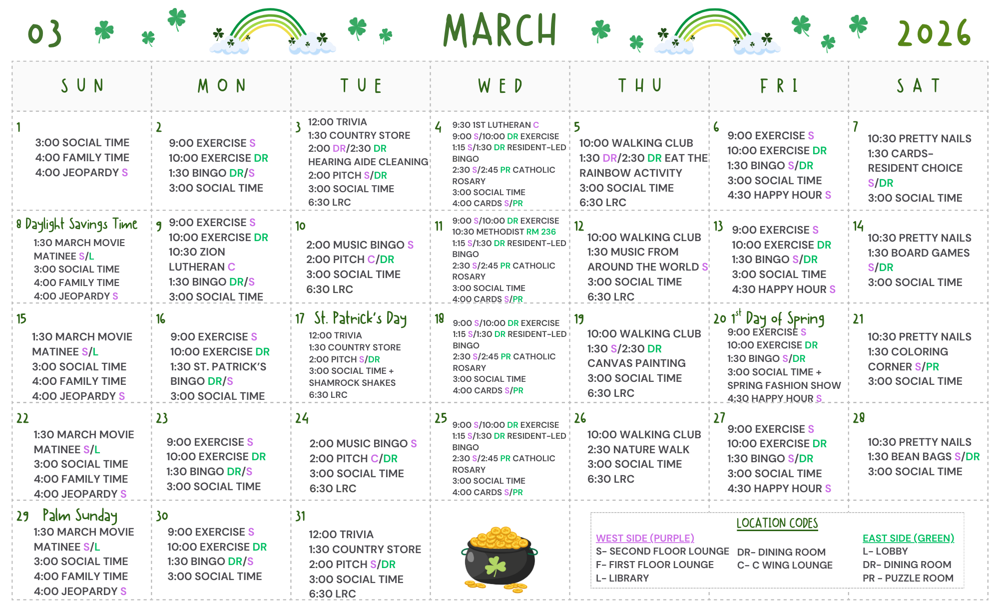 March is an exciting time at Countryside Living as we begin to say goodbye to winter and welcome the fresh energy of spring. Our March Activity Calendar and Menus are filled with colorful crafts, tasty treats, and fun celebrations designed to keep residents active, creative, and connected with one another.